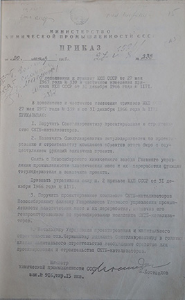 20 мая 1968 г. подписан Приказ Министра химической промышленности СССР № 239 «О дополнении к приказу МХП СССР от 27 мая 1967 года № 339 и частичном изменении приказа МХП СССР от 31 декабря 1966 года № 1171» поручить Союзглавреактиву проектирование и строительство СКТБ катализаторов. В 1968 году Новосибирский филиал ГИПРОПЛАСТа начал проектирование комплекса объектов СКТБ катализаторов.