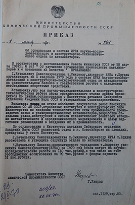 1 апреля 1969 г. подписан Приказ заместителя Министра химической промышленности СССР № 228 «Об организации Специального конструкторско-технологического бюро катализаторов /СКТБ катализаторов/ с опытным производством» на самостоятельном балансе и хозяйственном расчёте с наделением его необходимыми оборотными средствами и подчинением Союзглавреактиву.