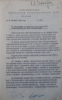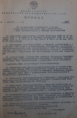 31 декабря 1966 г. подписан Приказ Министра химической промышленности СССР № 1171 «Об организации Специального конструкторско-технологического бюро катализаторов» в целях ускорения практического использования результатов научно-исследовательских работ, проводимых научными учреждениями Сибирского отделения Академии наук СССР.